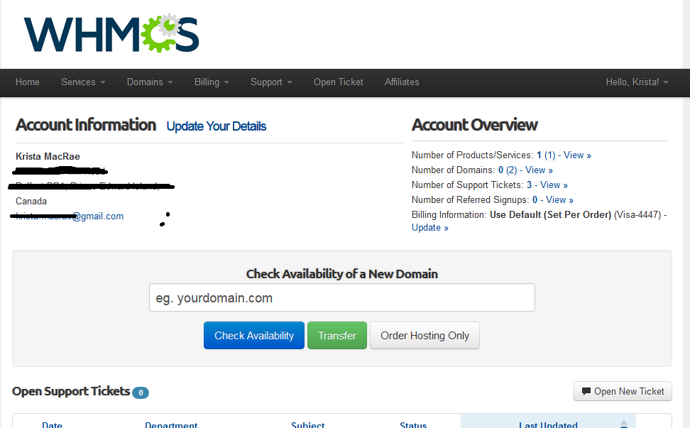 Below this is a rundown of the client’s account information. Company name, mailing address and contact email address. Lower again, you may have a feature to add funds to your account as well as quick statistics about your account. (eg: Products/Services, Domains, Tickets, Referrals, and Billing Information).